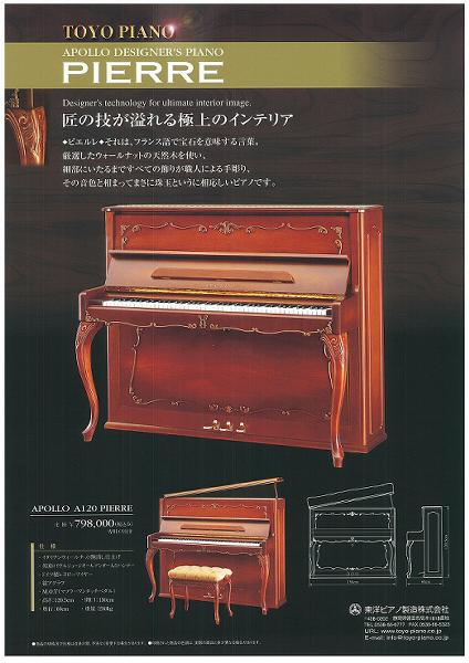 フランス語で珠玉という意味の言葉「ピエルレ」 この言葉を冠したピエルレはアポロの新製品です。 イタリアのウォルナット化粧版を使用した高級家具を思わせる斬新なデザイン。また、おそろいのイタリア製の高級ピアノ椅子も魅力のひとつです。 このピアノの天井のふたは従来のピアノのようにちょう番で開けることが出来る他、左の図のように支えの棒にてひらくことも出来ます。このため調律のときにいちいち天井のふたを取り外さなくてもよいので便利ですし安全です。 |