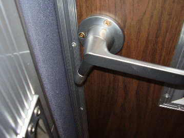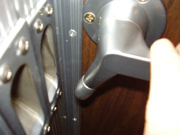 | ←防音ドアのハンドルの一部にある突起の部分がドア枠の受け金具にはまっていきます。 | |||||||||||||||||||||||||||||